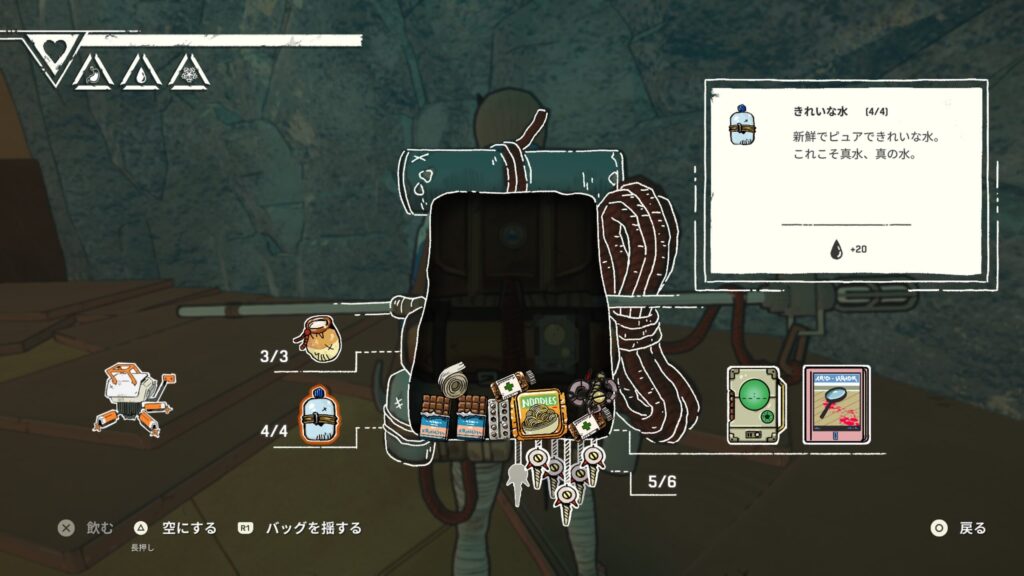 アーヴァには食料・水分・体温ゲージがあって、何もしていなくてもゲージはじわじわ減っていきます。