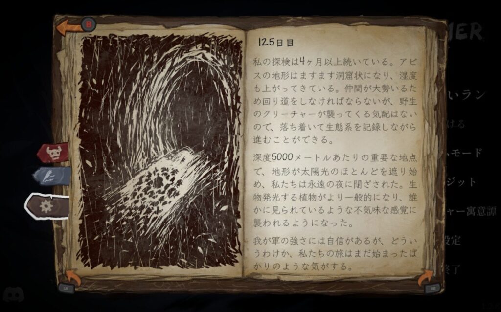 ストーリーは、ランをクリアするたびに溜まるポイントで徐々に解放されていく日誌で語られます。