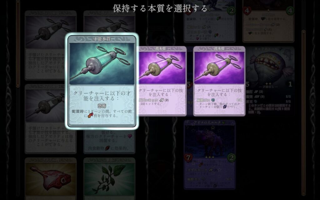 注射器は数が限られているものの、クリーチャー側の所持できるスキル数に制限がないので、育てたい個体に強スキルを盛るほど強くなります。