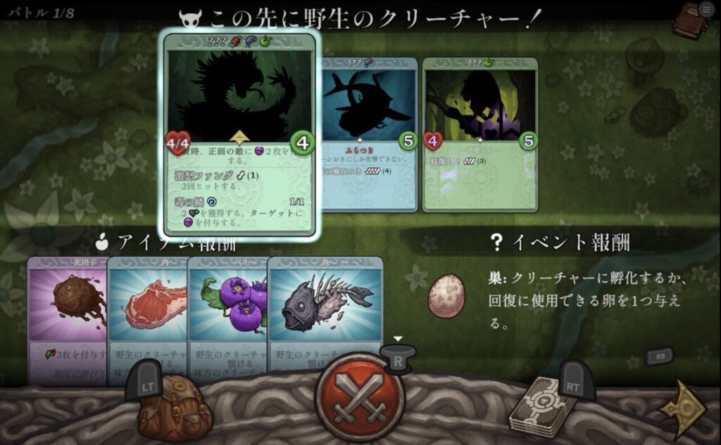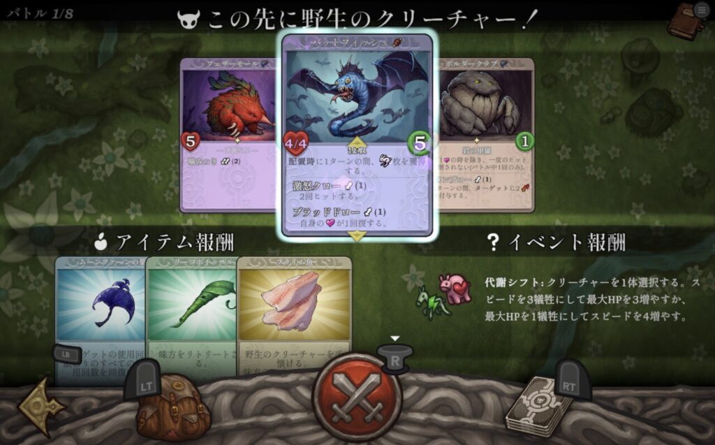 さらに食料は、各バトルの報酬で得られる限られた資源なので、「強い敵が出たから毎回仲間にしよう」は難しく、どのタイミングでどのクリーチャーに食料を使うかを慎重に考える必要があります。