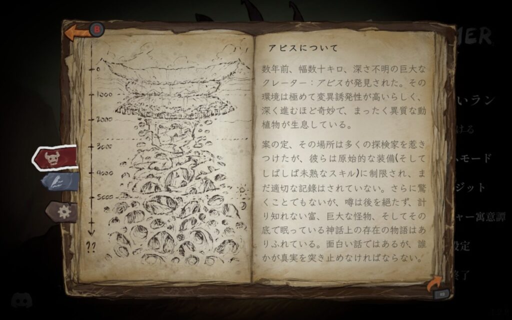 これはアビスに降りていく探検家の足跡が断片的に記されていて、この手のゲームにストーリー性を求める人は少ないと思いますが、ダークな内容は読んでいて普通に面白かったですね。