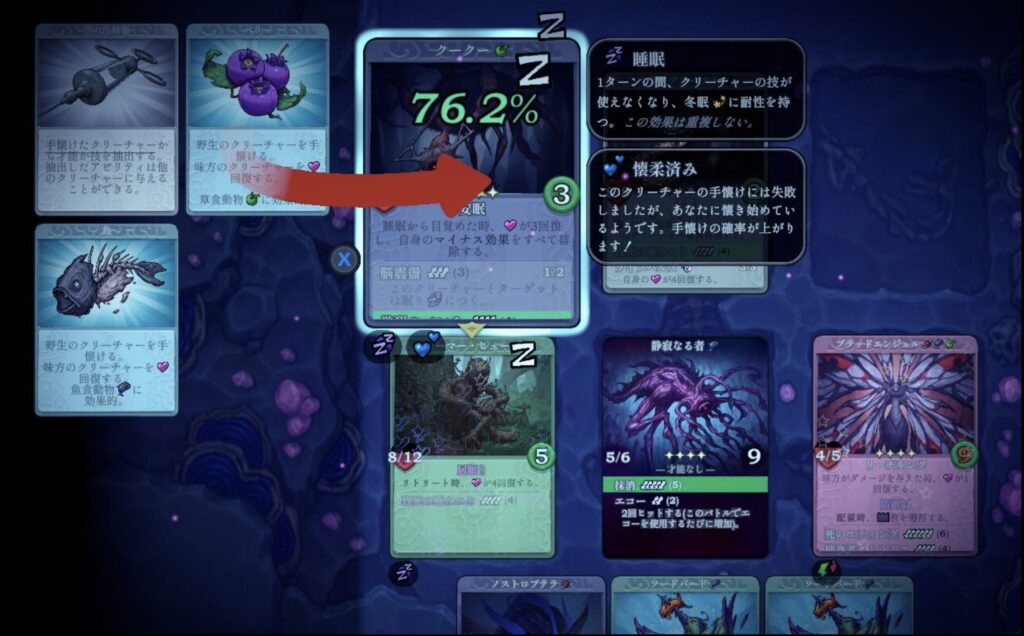 - クリーチャーごとに好みがあり、好みに合うほど成功率が上がる