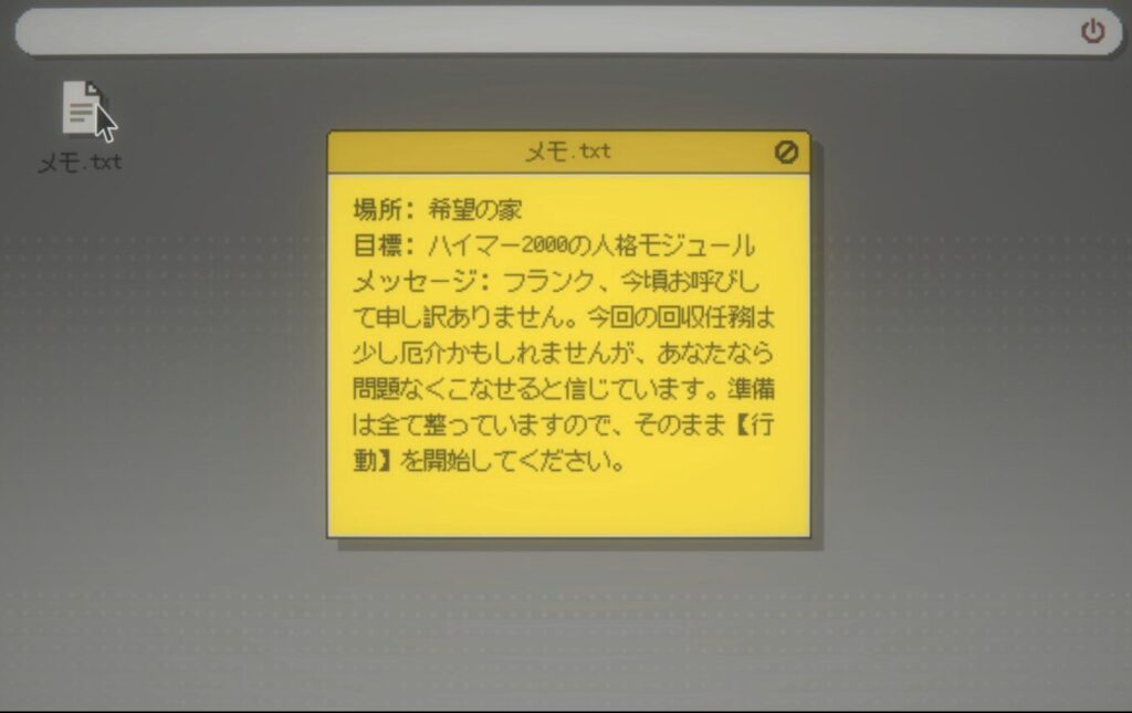 『ハイマー2000』はAI会話型謎解きゲームです。あなたは回収員フランクを操作し、荒廃した「希望の家」へ向かい、人工知能「ハイマー2000」の回収任務を行います。